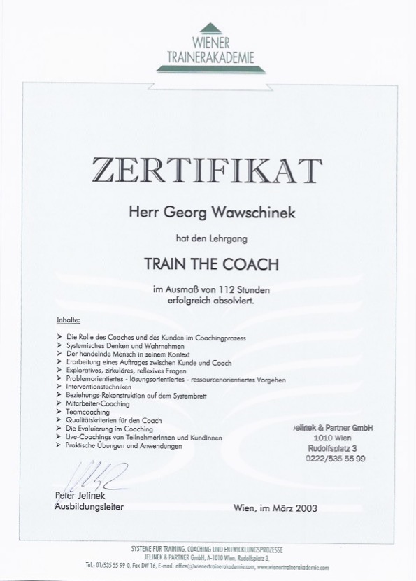 Mit Beginn der Selbständigkeit hat Georg Wawschinek die Ausbildung zum Wirtschaftscoach (Wiener Trainerakademie) und NLP Master (Institut für strukturelle Wahrnehmung, Graz) absolviert. Permanente Fortbildungen im unmittelbaren und anderen Bereichen gehören zum Konzept von Georg Wawschinek. Unter anderem waren dies Fortbildungen bei Alexander Christiani, Matthias Phöm, Michael Rossié, Roman F. Szeliga, Dirk W. Eilert und vielen mehr.
