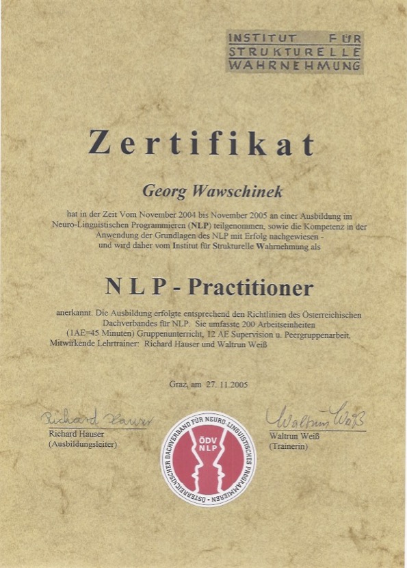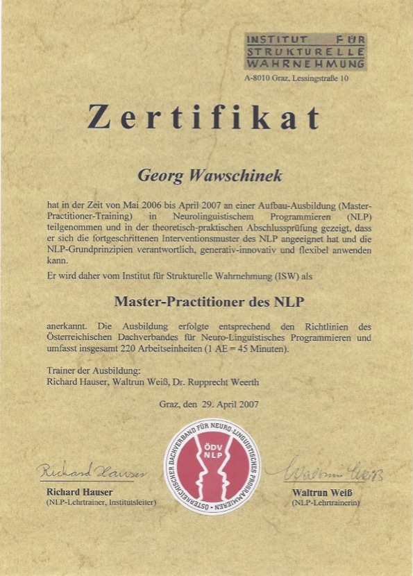 • NLP Master Practitioner – Institut für strukturelle Wahrnehmung Graz